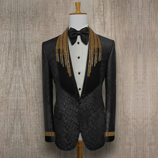 Costume homme en jacquard noir avec bordure dorée, deux pièces, blazer de soirée, tenue de marié (veste + pantalon)