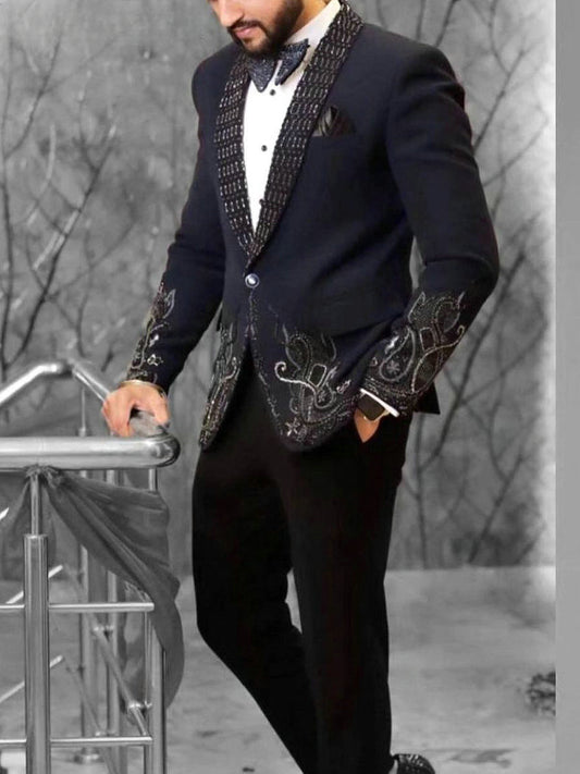 Costume deux pièces noir de luxe fait main avec perles et cristaux pour homme (veste + pantalon)
