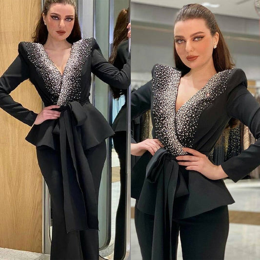 Costume de mariage noir de luxe pour femme, blazer avec ceinture et pantalon, robe de soirée formelle, smoking sur mesure