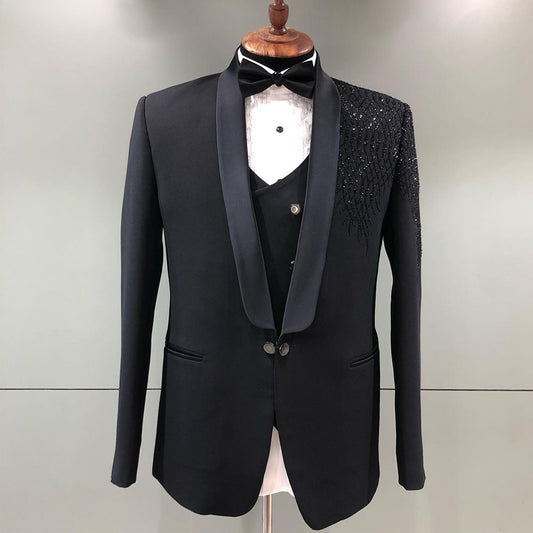 Blazers à perles noires pour hommes, costumes de banquet à la mode, veste d'affaires 3 pièces, gilet, pantalon