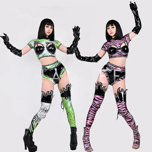 Sexy léopard cristal bikini gants en cuir couvre-jambes vêtements de performance femmes drag queen costume danseur jazz équipe scène vêtements