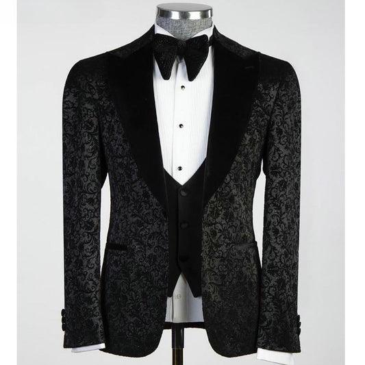 Costume homme trois pièces en jacquard noir (veste + gilet + pantalon)