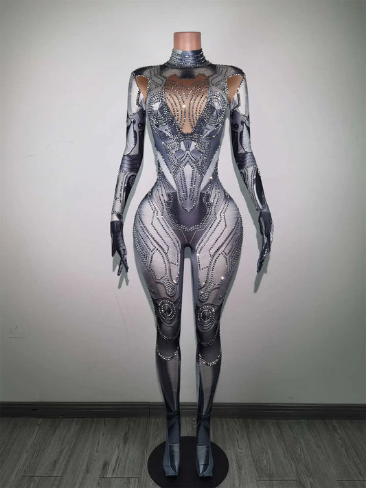 Costume de danse sexy pour femme, combinaison avec strass argentés scintillants et gants, tenue de scène pour boîte de nuit