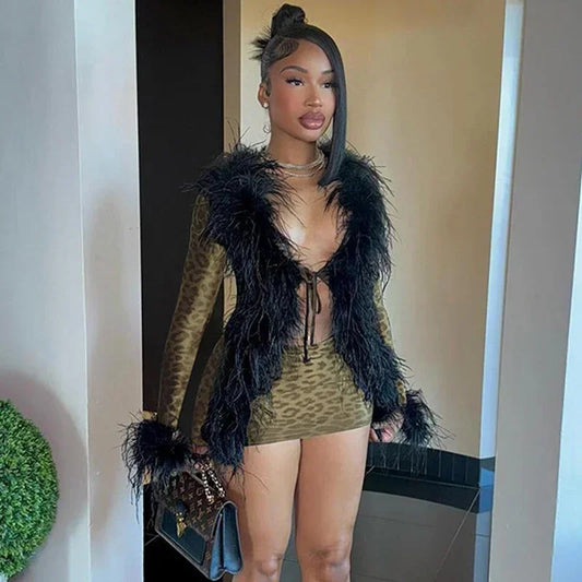 Sexy Women Furry Collar Leopard Bodycon Dress Long Sleeve Lace-up Mini Dress Party Club Lady Cute Fur Bandage Cut-out Dress