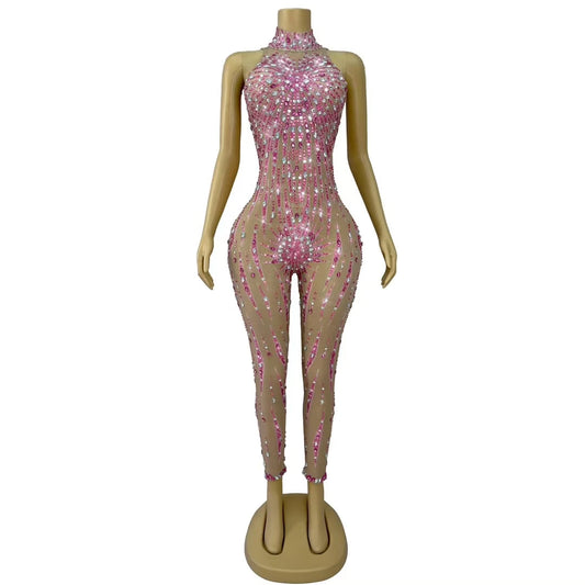 Shining Pink Rhinestones Jumpsuits Singer Dancer Performance Party Celebrate Show Wear Sexy Transparent Costume