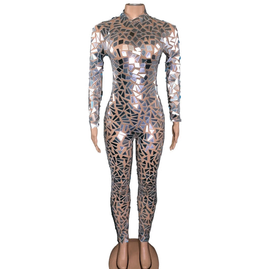Combinaison de scène à miroirs brillants pour femmes, combinaison sexy en maille à manches longues, tenue de discothèque, costume de danseuse et de chanteuse