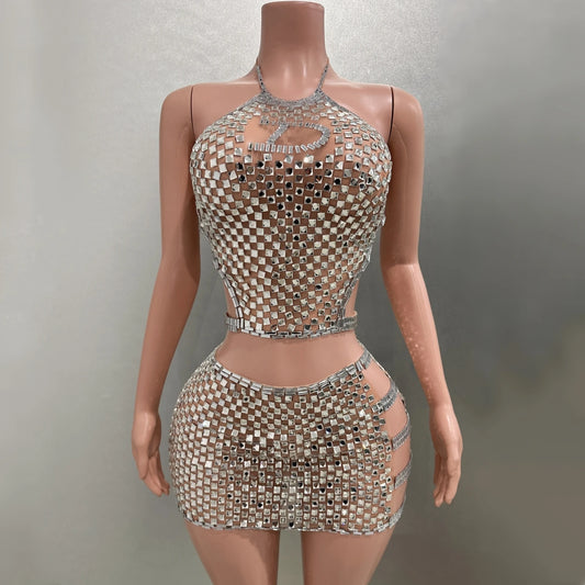 Costume deux pièces sexy transparent pour femme, mini-robe fourreau avec cristaux brillants et diamants argentés, idéal pour une fête d'anniversaire ou une performance