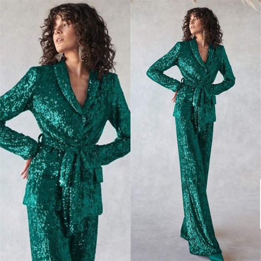 Ensemble de costumes à paillettes brillantes pour femmes pour fête 2 pièces Blazer avec ceinture + pantalon robe de soirée formelle tapis rouge sur mesure