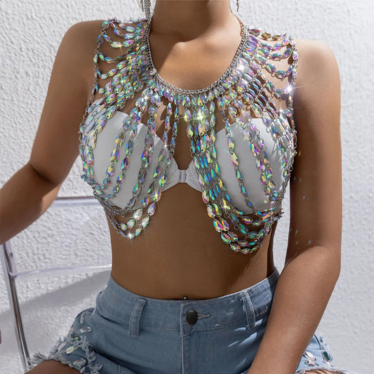 Chaîne de corps chic et brillante en pierres précieuses colorées pour femmes, sexy, multicouches, pompon, cristal, poitrine, soutien-gorge, bikini, gilet, bijoux de fête, cadeaux