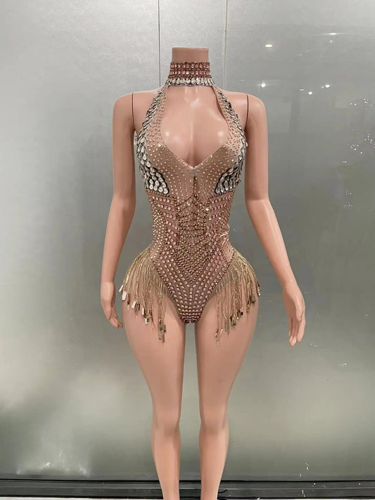 Step into the spotlight with this shiny crystal sequin bodysuit, designed to accentuate your curves...