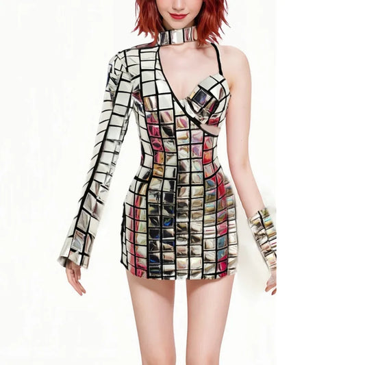 Brillez de mille feux avec cette mini-robe argentée effet miroir laser. Dotée d'une manche unique...