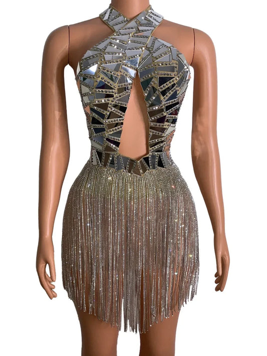 Shine like a star in this exquisite silver mirror crystal tassel dress, designed for women...