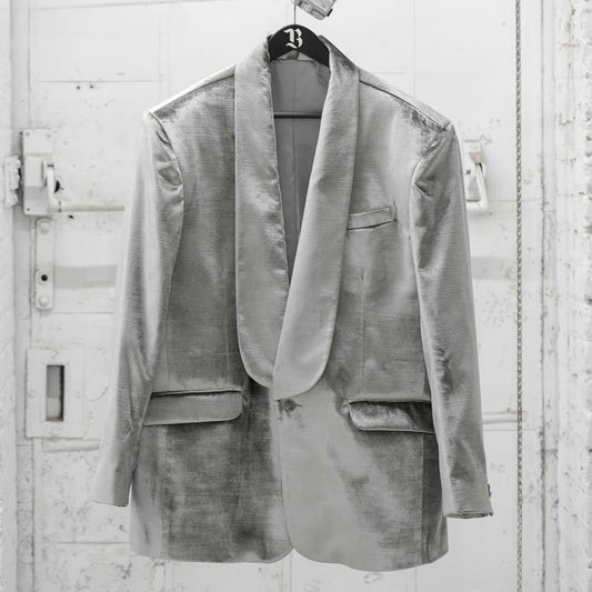Sublimez votre style avec notre costume homme en velours argenté, un parfait mélange de mode...