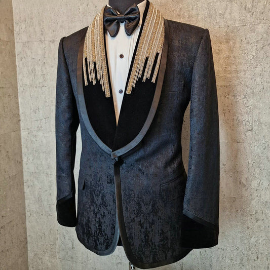 Ce smoking de mariage en velours noir respire l'élégance avec ses perles de cristal et...