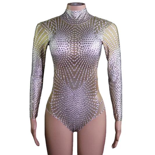 Sparkly Full Rhinestones Long Sleeve Leotard Nightclub Singer Dancer Stage Wear Performance Dance Costume Party Bodysuit