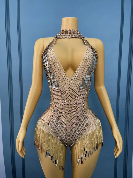 Turn every head in this sparkly rhinestones chain and sequins bodysuit, designed for women who...