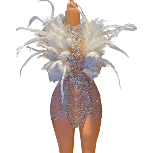 Robe courte en maille sexy pour femme, avec strass scintillants, chaînes et plumes, tenue de danse, de spectacle, de discothèque, de scène
