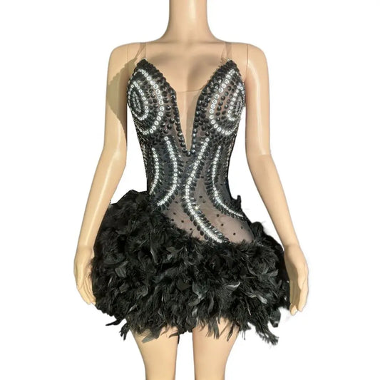 Robe noire à strass scintillants et plumes pour femme, tenue de soirée transparente en maille, tenue de spectacle et de danse