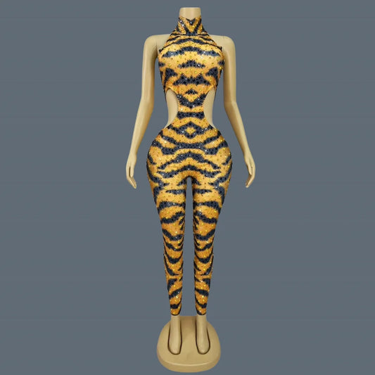 Unleash your wild side with this sparkly rhinestone tiger pattern jumpsuit. Featuring a tight-fitting, sleeveless...