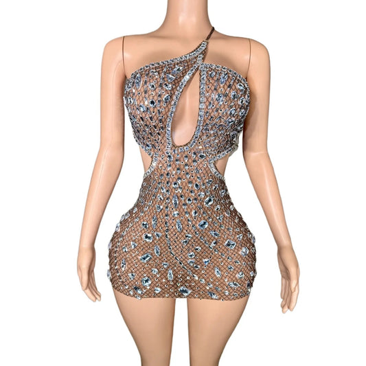 Sparkly Rhinestones Backless Mini Dress Women Sexy Hollow Mesh Transparent Celebrate Evening Birthday Dress Photo Shoot Wear
