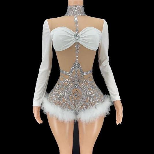 Sparkly Rhinestones Long Sleeve Transparent Feather Bodysuit Sexy Dance Costume Birthday Party Night Outfit Leotard Stage Wear