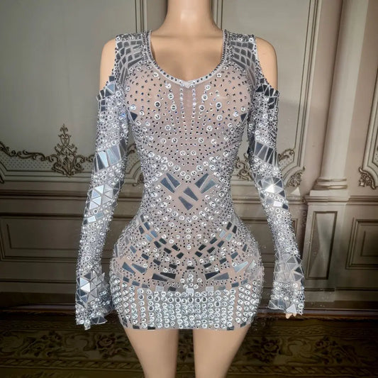 Sparkly Rhinestones Mirrors Short Skirt for Women Sexy Long Sleeve Transparent Evening Prom Birthday Dress Photo Shoot Wear