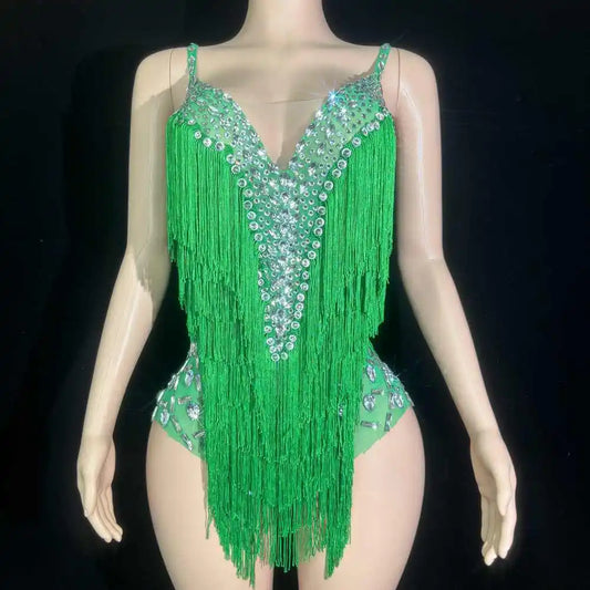 Sparkly Rhinestones Tassel Tight Bodysuit For Women Luxury Sexy V Neck Performance Dance Costume Night Club Show Stage Outfit