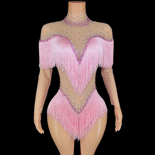 Body rose à strass scintillants et pompons pour femme, tenue de danse sexy en maille, tenue de scène, tenue de discothèque