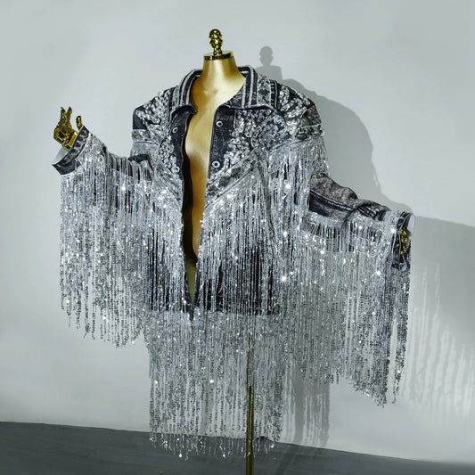 Sparkly Sequin Tassels Jacket Long Sleeve Silver Extra Large Coat Men Singer Show Costume Evening Dance Stage Celebrate Outfit