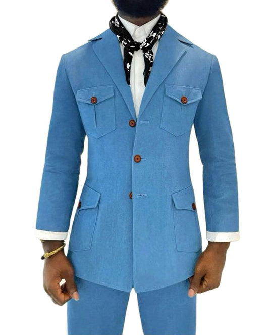 Costumes Safari sur mesure pour hommes, manteau en jean bleu clair, blazer, pantalon, costume homme 2 pièces, veste, pantalon, costume social, tenue de dîner