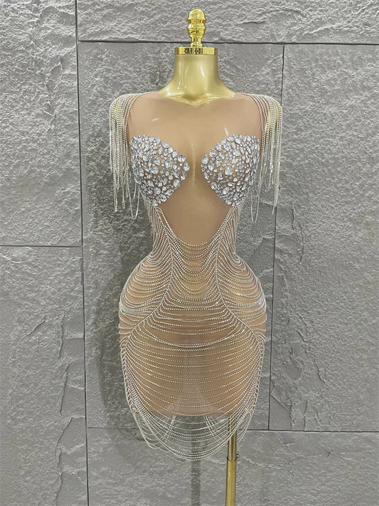 Robe moulante sexy en maille transparente avec gros cristaux pour femme, tenue scintillante pour célébrer une soirée en boîte de nuit, un anniversaire ou une scène