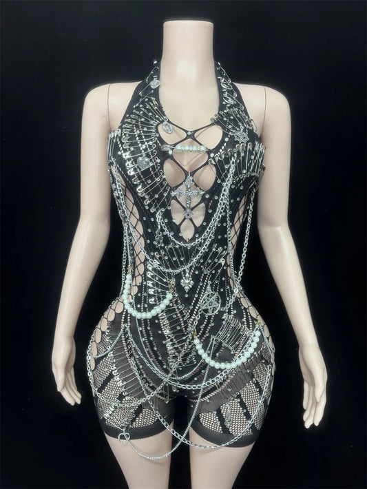Women Sexy Halter Sleeveless Hollow Out Playsuit High Street Pin Decoration Backless Performance Stage Outfit Nightclub Costume