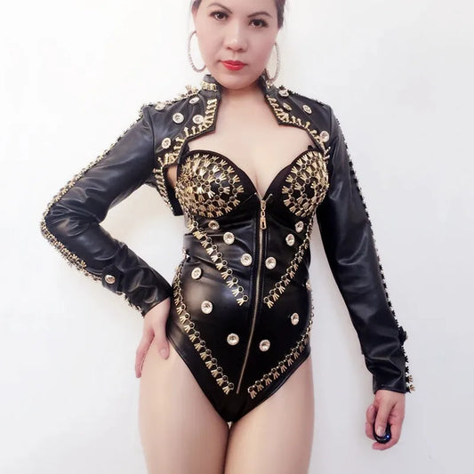 Costume de chanteuse de jazz pour femme, tenue de spectacle, combinaison en cuir noir et blanc avec rivets, tenue de discothèque, tenue de spectacle sexy sur scène