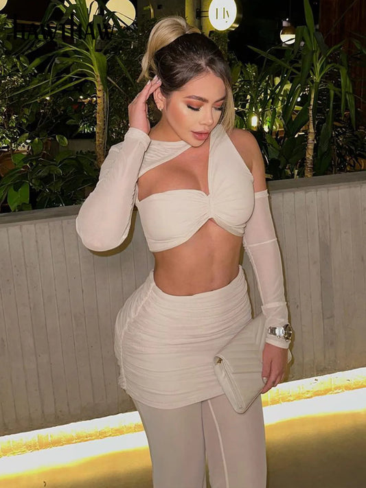 Women Spring Long Sleeve Crop Tops Long Pants Party Club Two Piece Sets Outfits