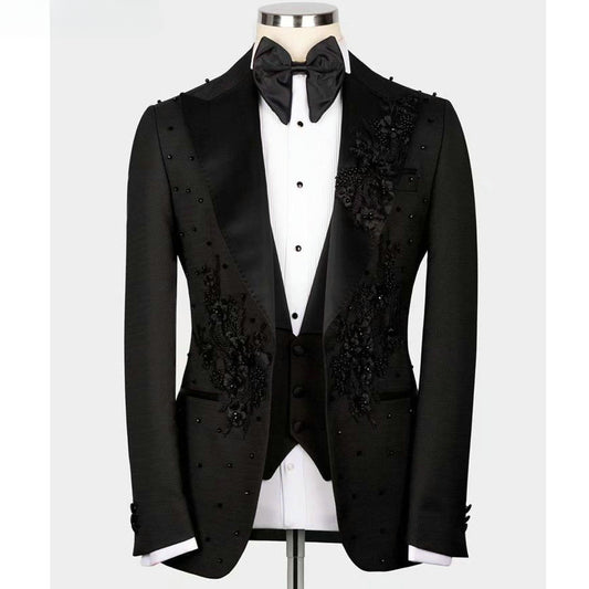 Costume 2 pièces noir élégant en dentelle florale 3D et perles pour homme (veste, pantalon et gilet)