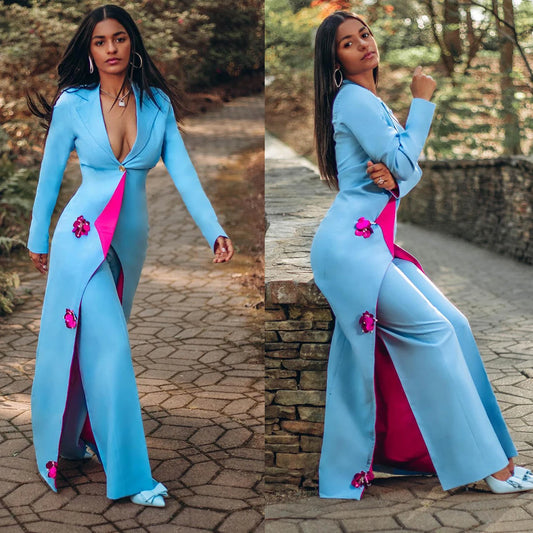 Fashion Women Suit Pearls 3D-Flower Lady Set V-Neck Slim Fit Backless Long Sleeves Coat Custom Made 2 Pcs Coat Pants