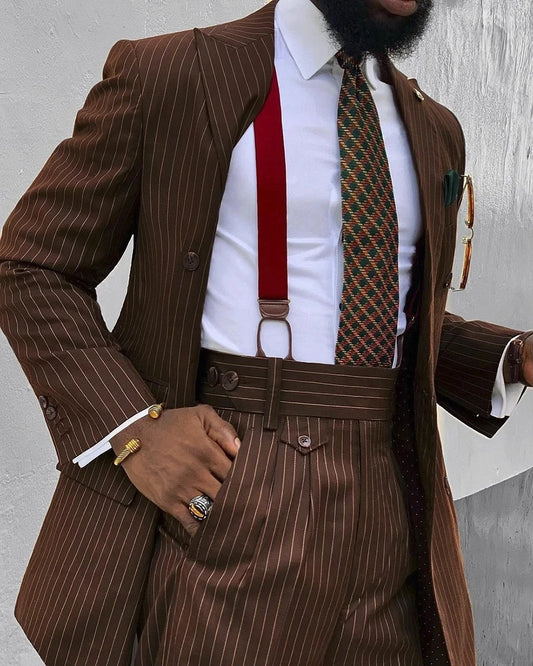 Costume homme 2 pièces à rayures marron, croisé, sur mesure, pour mariage, bal de promo, coupe slim, revers pointus, pantalon (veste + pantalon)
