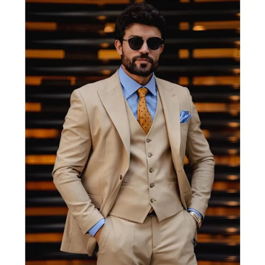 Costume homme beige à revers crantés, un bouton, 3 pièces, costume homme marié, mariage, coupe slim, veste blazer, pantalon et gilet
