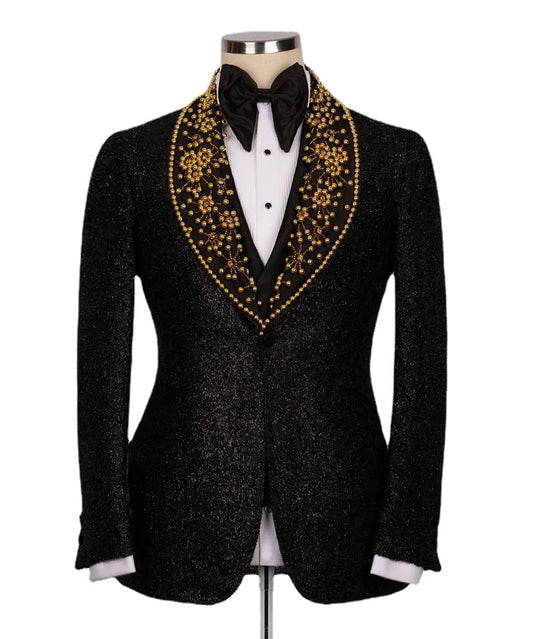 Costume de mariage 3 pièces pour homme, veste, gilet et pantalon, avec perles dorées et paillettes noires, sur mesure, pour bal de promo ou soirée