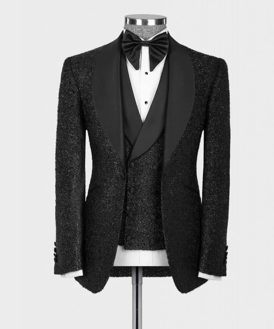 Costume de mariage de luxe à paillettes pour homme, 3 pièces, noir, formel, blazer, gilet, pantalon, costume de bal de promo pour homme