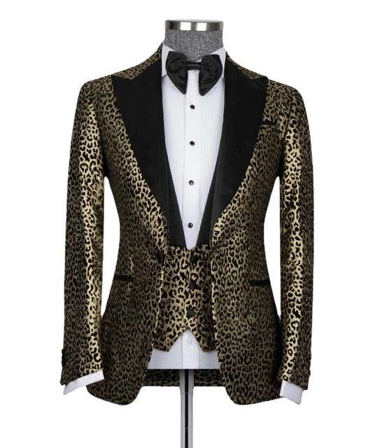 Costume 3 pièces imprimé léopard pour homme, blazer, gilet, pantalon, tenue de soirée, mariage, bal de promo, formel, doré et noir