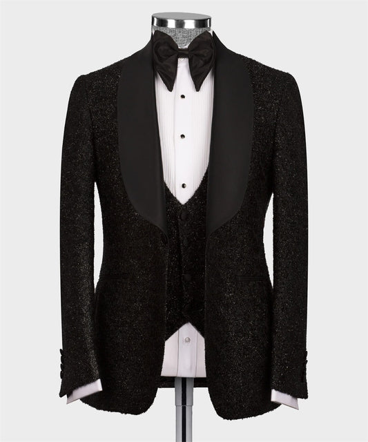 Costume de mariage noir à paillettes avec col en satin, costume de marié formel noir pour homme, coupe slim, 3 pièces, blazer, gilet, pantalon, tenue d'affaires