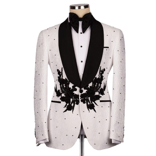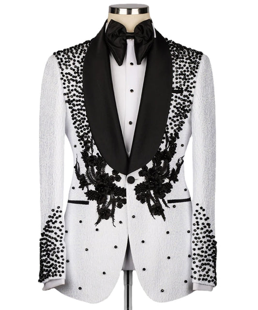 Smoking de mariage blanc brodé de fleurs, fait à la main avec perles, costume de marié de luxe, blazer, gilet, pantalon, costume de fête de bal