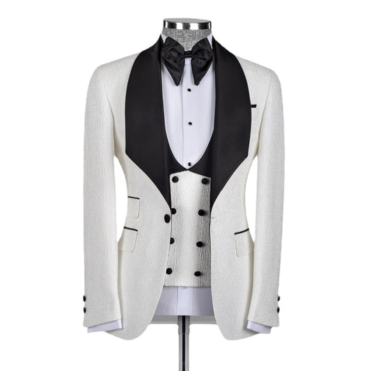 Costume de mariage 3 pièces pour homme, col en satin noir, smoking blanc, blazer, pantalon, costume de soirée formel pour homme
