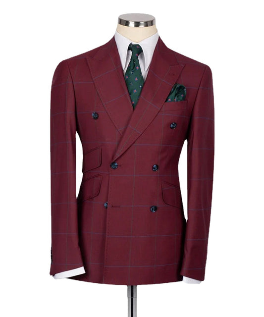 Costume homme bordeaux à carreaux croisé pour mariage, coupe slim, 2 pièces, blazer et pantalon, tenue d'affaires, soirée formelle, élégant