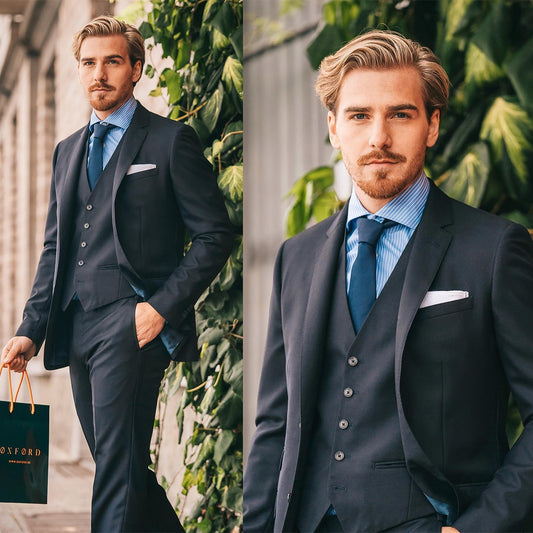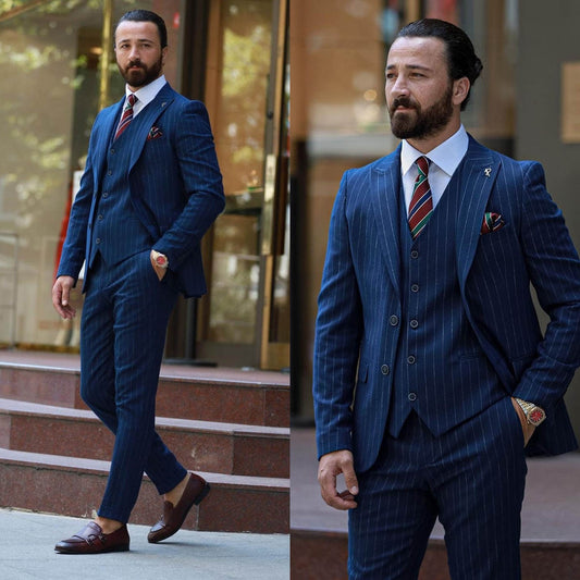 Costume 3 pièces bleu marine pour homme, blazer, gilet, pantalon, simple boutonnage, revers en pointe, rayures fines, costume sur mesure pour marié