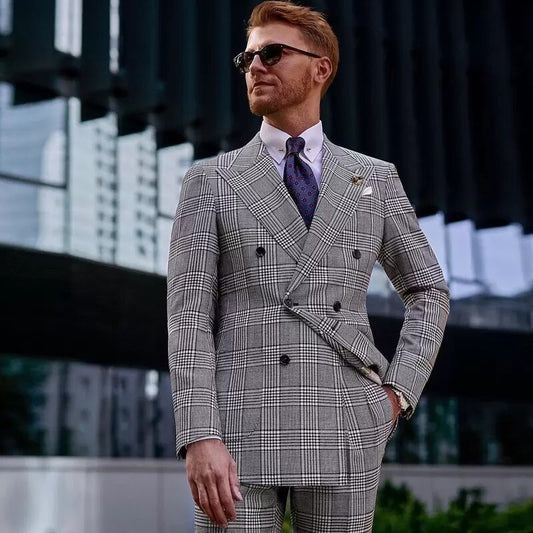 Costume homme 2 pièces à carreaux, blazer, pantalon, smoking, croisé, rayures, gris, revers larges, travail, mariage, marié, sur mesure