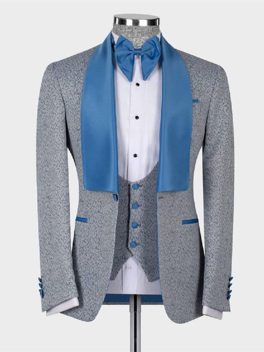 Costume 2 pièces en jacquard pour homme, blazer gris, gilet, un bouton, satin bleu, revers transparent, costume sur mesure pour mariage d'affaires
