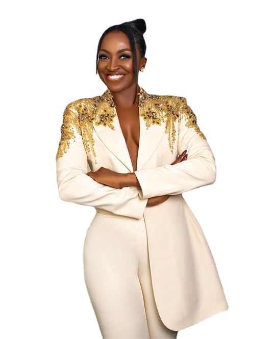 Ensemble de costume de luxe 2 pièces pour femme, blazer et pantalon, veste à perles appliquées dorées, smoking de mariage, robe de bal sur mesure