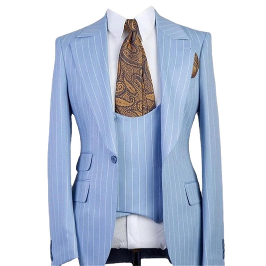 Costume Homme Bleu Clair À Rayures Hommes Costumes 3 Pièces Un Bouton Revers en Pointe Décontracté Marié Mariage Slim Fit Blazer